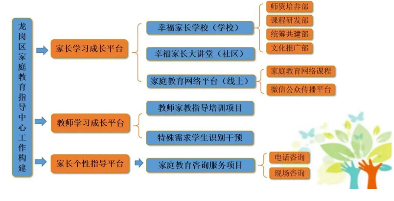 龙岗区教育科学研究家庭教育项目组,统筹构建了“五段四类四块”家庭教育版权课程体系。通过家庭心理教育研究工作室团队成员4年不断实践、研发,累计探究了69套的家庭教育版权课程,其中6套中小学教师家庭教育指导能力提升课程,整理汇编系列家庭教育指导丛书。在家庭教育指导领域,龙岗区已经进行了深入的探索,迄今在普及家庭教育知识及培养中小学教师家庭教育指导能力方面已然形成了一套相对完善、科学的家庭教育指导体系。